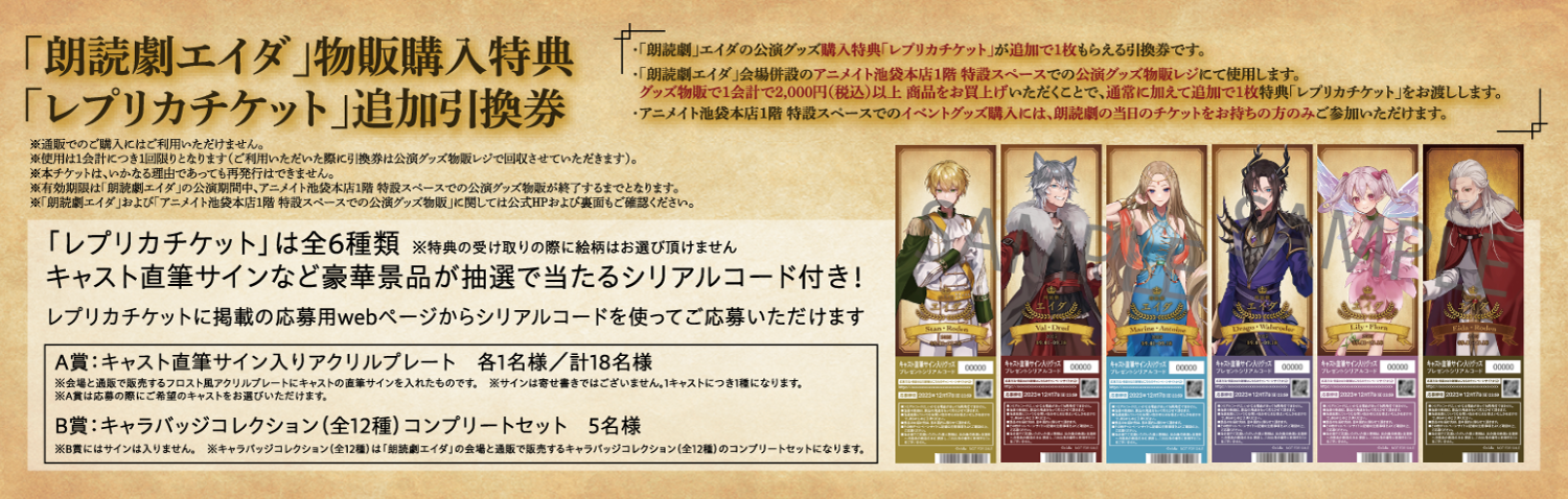 (朗読劇の公演期間中、アニメイト池袋本店1階 特設スペースでの公演グッズ物販レジで使用できる引換券です。公演グッズ物販は朗読劇の当日のチケットをお持ちの方のみご参加いただけます。グッズ物販で1会計で2,000円(税込)以上 商品をお買上げいただくことで、通常に加えて追加で1枚特典「レプリカチケット」をお渡しします。通販ではご利用いただけません。公演グッズ物販について詳しくはHPの【商品販売について】をご確認下さい)